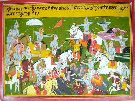 | Description / विवरण | Miniature painting based on Harivansha depicting the scene of war between Krishna and Jarasandha. |