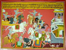 | Description / विवरण | Miniature painting based on Harivansha depicting war scene between the army of Krishna and the army of Rukmak. At the extreme left, Rukmani is shown standing and watching from a window from the palace. |