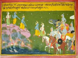 | Description / विवरण | Miniature painting based on Harivansha depicting Krishna talking to Balbhadra. They are shown coming down from a hill and walk towards the waiting army. |