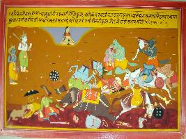 | Description / विवरण | Miniature painting based on Harivansha depicting a heavy destruction and defeat of the army of Jarasandha and a lady seated above and watching. Krishna and Balram are standing victorious in the right side. |