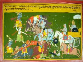 | Description / विवरण | Miniature painting based on Harivansha depicting war between Krishna-Balram and Jarasandha. Krishna and Balram alone are attacking the huge army of Jarasandha, who is sitting on a chariot in the left side. |