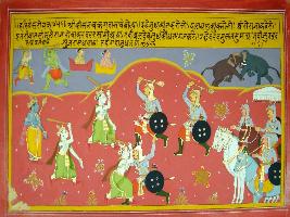 | Description / विवरण | Miniature painting based on Harivansha depicting war between Krishna- Balram and Jarasandha. Balram is killing the soldiers of Jarasandha. They are compared with Indra fighting a demon and two elephants fighting each other. |