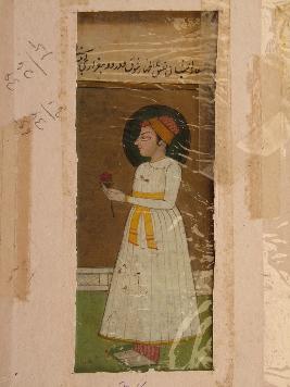 | Description / विवरण | This is a painting of a ruler with a flower in his hand. He is wearing white tunic, a yellow colour cloth serve as a belt. He is shown with one foot. He is wearing a turban in black and red colour and is halo is at back side of his head. |