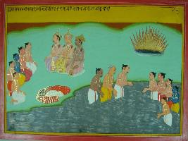 | Description / विवरण | Miniature painting based on Mahabharat - Adi parva depicting the Pandavas are sitting with Dhritrashtra, while Pandavas are seen in the Surya namaskara position in the river Ganga. |