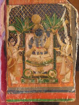 | Description / विवरण | This painting depicts Srinathji with two devotees. Shrinathji is in seated posture and he has been shown jeweled. He is shown on a chariot which is having two wheel. In the background geometrical patterned design have been shown. Also leafs of three can be seen in it. |