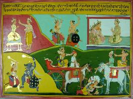 | Description / विवरण | Miniature painting based on Mahabharat - Adi parva depicting that king Shantanu had a son called Vichitravirya. He gave his reign to Bhishma because he was the eldest king. Later on there is a war in which he dies. |