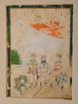 | Description / विवरण | This is a painting of a Royal family in which three persons are shown two are in sitting posture and one is in standing posture. The central figure has beard and moustache with a royal dress, other two are without moustache and richly ornamented |