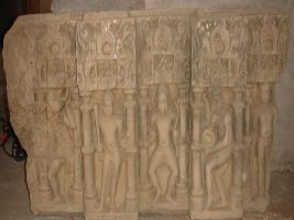 | Description / विवरण | A sculptured architectural fragment of a lintel of a temple depicting at the extreme right a standing male figure, drinking wine. His body and left legs are rubbed off. Next to him is a male figure, standing and holding a mace with right hand and tussle of the drapery in the left. Another male figure is standing and holding a pot with right hand and a snake in the left. A male musician is holding a musical instrument probably dafli, and in the extreme left a nude human figure is standing and his left hand is broken. |