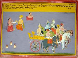| Description / विवरण | Miniature painting based on Harivansha depicting a sage telling story to a man at the top right part, about Krishna, Balram and king Damghasha sitting on their chariot and going to swarg lok. |