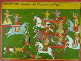 | Description / विवरण | Miniature painting based on Mahabharat - Adi parva depicting Bhishma after eloping Kashi princess, fighting with Shalya king. |