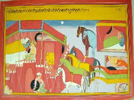 | Description / विवरण | Miniature painting based on Harivansha depicting Krishna and Balram travelling to city Mathura. Krishna and Balram is shown sleeping in their tent with Akrura is sitting nearby. Outside the tent, horses are tied in a row. At the left part, some men is depicted sleeping in their carriages. |