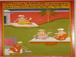 | Description / विवरण | Miniature painting based on Sarangadhar depicting two seated men in the centre, talking with each other with books in their hand. In upper part, a man is sitting holding a book in his hands. In the lower part, a goldsmith is depicted. |
