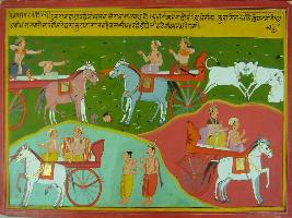 | Description / विवरण | Miniature painting based on Mahabharat - Adi parva depicting Bhishma after eloping Kashi s princess, fighting with Salva king. He killed his charioteer and make him prisoner. Then, Bhishma is shown leaving the field. |