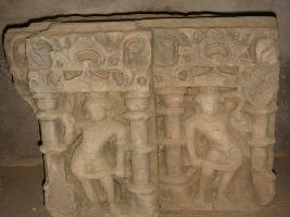 | Description / विवरण | A sculptured architectural fragment depicting two Shiva ganas in a 2 niches. The right of the gana standing at right side is uplifted, and left hand is lying parallel to his body. He is adorned with a necklace, earring. armlet and bangles. The gana standing at the left end is holding a snake in his left hand, while his right hand is lying parallel to his body. He too adorned with jewels. |