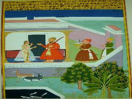 | Description / विवरण | Miniature painting based on Kalila Damana. This is a scene of palace queen is depicted talking to merchant and behind him one man with a bird is depicted and the slave behind him. In the lawn two deer is depicted, pond is depicted with fishes and some trees. Mughal influence can be seen. |