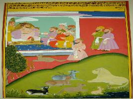 | Description / विवरण | Miniature painting based on Kalila Damana depicting on the upper right side a king sitting on a throne listening to a message read by his official. Kalila is seen sitting near the king. At the lower part Damana with other animals talking to the lion in a cave, is depicted. Painting has Mughal influence. |