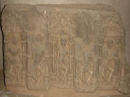 | Description / विवरण | A sculptured architectural fragment probably part Lintel, depicts 5 figures of celestial musicians and dancers carved in niche. From right end 1 celestial drummer 2 celestial dancer without head broken out 3 celestial dancer 4 celestial dancer with head chopped away 5 celestial drummer. |