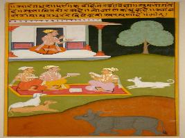 | Description / विवरण | Miniature painting based on Sarangadhar depicting three men sitting and discussing with scriptures in their hands. In the upper part, a man is sitting with a book in his hands. |