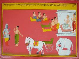 | Description / विवरण | Miniature painting based on Mahabharat - Vana parva. The painting depicts that Malati ask to Arjun to seat on the chariot. While Indra is seen along with other Devtas on the top of the painting. |