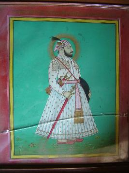 | Description / विवरण | This miniature painting represents Sangram Singh in standing posture almost from lateral view. He is wearing a highly designed tunic, a crown which is having a feather, and designed shoes, and a scarf in his waist. He is holding a sword along with scabbard with right hand while a shield with left hand. In the background green colour in dominating while in the fourground grass and flowers can be seen. It is mounted in a wooden from now. |