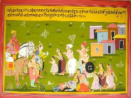 | Description / विवरण | Miniature painting based on Harivansha depicting that the citizens of Srigala kingdom praying Krishna to pardon them, while Krishna and Balram are seen along with their companions in front of them. |