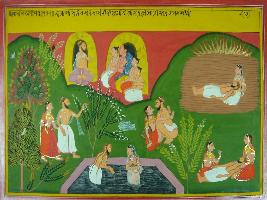 | Description / विवरण | Miniature painting based on Mahabharat - Adi parva depicting that Vyas is telling Pandavas a story about Raja Pandu. He was given a curse by Mrig rishi that if he will have sex with anyone than he will die. He sees Madri having bath, he has sex with her and dies. Madri and Kunti are sitting beside the dead body and later on Madri becomes Sati. |