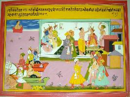 | Description / विवरण | Miniature painting based on Harivansha depicting the coronation ceremony of Panajeet, where Krishna is seen in the right side. It also depicts the leaving of Krishna with his companions from Srigala Rajya. |