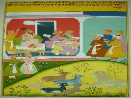 | Description / विवरण | Miniature painting based on Kalila Damana depicting on the upper right side, a king talking to his peoples 4 in number . Behind them four men are seen standing outside the courtroom. At one side two men are depicted standing with folded hands. At the lower part Damana with other animals sitting in front of their king, the lion and talking to him in a cave is depicted. Painting has Mughal influence. |