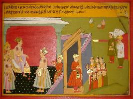 | Description / विवरण | Miniature painting based on Prithviraj Raso depicting six females coming to meet Chandvardai and ask the guard to inform him. The guard inform, it to him and Chandvardai ask the women to come. |