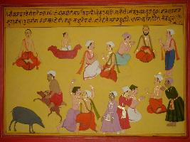 | Description / विवरण | Miniature painting based on Shri Bhagwat Gita. It depicts Krishna preaching Arjun that education and illiteracy, happiness and sadness, honour and insult, friend and foe, honesty and sin all are not equal and one soul is a foe of another soul. |