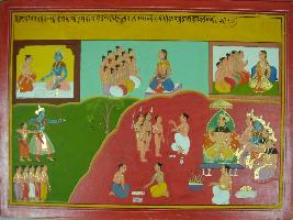 | Description / विवरण | Miniature painting based on Mahabharat - Adi parva depicting Pandavas and Draupadi having five sons. They are shown having Sanskara, being taught bow and arrow by Arjun and Dharma and Veda by Yudhisthir. |