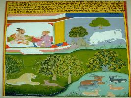 | Description / विवरण | Miniature painting based on Kalila Damana depicting seated and talking to his minister, a ox shown in formidable pose. Below Damana telling story to lion and group of animals seated on left side. Painting having Mughal influence. |