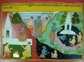 | Description / विवरण | Miniature painting based on Mahabharat - Adi parva depicting Arjun going out for penance after he committed the sin of entering in the room of Yudhisthir in the presence of Draupadi. It also depicts Arjun doing pilgrimage and visited many temples, tirth and performed yagna. |