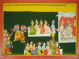 | Description / विवरण | Miniature painting based on Mahabharat - Vana parva. The painting depicts that Arjun is paying respect to Indra. While other devotees are sitting on the court. While the Apsaras are seen dancing and singing on the occassion. |