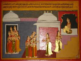 | Description / विवरण | Miniature painting based on Prithviraj Raso depicting friends of Rajmati praising Prithviraj and his court in front her. Then her friends left and Rajmati is depicted at the upper left side thinking about that. |