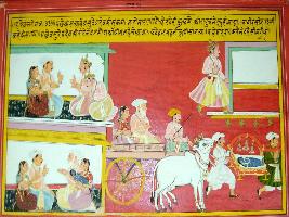| Description / विवरण | Miniature painting based on Harivansha depicting Kansa comes to Vasudev and Devki and tell them that their son will kill him, in future so, he will kill their child in earlier stage. Later Nanda and Yashoda come to Vasudev and Devki and take Krishna along with them. |