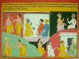 | Description / विवरण | Miniature painting based on Mahabharat - Rajdharma parva. Thje painting depicts that Yudhisthir became the king than Vyarh says look after the subject and also askDhitarasta togiveproper donation to Brahman. |