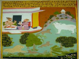 | Description / विवरण | Miniature painting based on Kalila Damana. It depicts, Damana talking to lion and then moves towards a cow. On upper part, a palace is seen and two nobles are seen inside talking with each other. Painting has Mughal influence. |