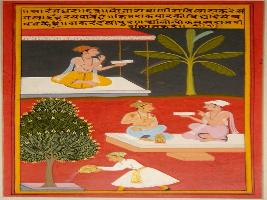 | Description / विवरण | Miniature painting based on Sarangadhar. A man is depicted sitting and holding a granth in the upper part. In the lower part, a man is depicted talking with another man holding a granth, and a man pouring water to a tree. |