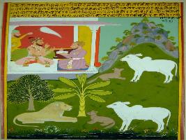 | Description / विवरण | Miniature painting based on Kalila Damana. In lower part, a lion and a cow is seated in front of Damana and on upper part Damana is seated with a cow. On top part of the painting, two nobles are seated and talking with each other. Painting has Mughal influence. |