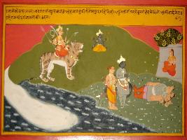 | Description / विवरण | Miniature painting based on Prithviraj Raso depicting Kavi Chandvardai meditating on the bank of river Ganga. Also depicting Durga, Vishnu and Ram killing Ravan. |