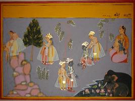 | Description / विवरण | Miniature painting based on Sanskrit drama Malti Madhav. In right part of the painting, a person is depicted trying to kill himself and a woman saves him. He is probably Makarand. In central part Madhav is depicted meeting with Makarand. In left part, a woman is depicted feeding 2 babies. In lower left part two elephants are depicted. |