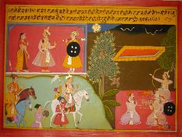 | Description / विवरण | Miniature painting based on Prithviraj Raso. A Samant informing Prithviraj about 100 soldier and 6 skilful warriors entering the palace. At left side the king is depicted killing a bird in the garden. |