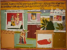 | Description / विवरण | Miniature painting based on Sanskrit-drama Malti Madhav depicting Makarand telling Madayantika that it become midnight and all persons are sleeping in their houses and women are roaming on the road after getting drunk. |