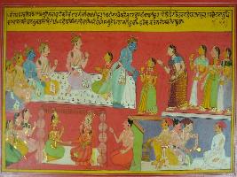 | Description / विवरण | Miniature painting based on Mahabharat - Virat parva. The painting depicts that marriage ceremony of Uttara and Abhimanyu while Pandavas are seen with Krishna and Sudarshana and on this occassion people are taking meal. |
