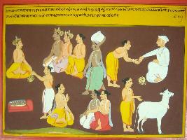 | Description / विवरण | Miniature painting based on Mahabharat - Rajdharma parva. The painting depicts that king Yudhisthir is sitting with Bindun and Sanjay and donate to the Brahman while Dhritrashtra also donate wealth and cow to the Brahman. |