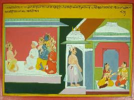 | Description / विवरण | Miniature painting based on Mahabharat - Rajdharma parva. The painting depicts that Yudhisthir is talking with Dhritrashtra and his brother and after this coversation Yudhisthir proceeded to his home. |