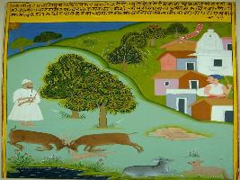 | Description / विवरण | Miniature painting based on Kalila Damana depicting a Fakir standing near the trees below it two deer fights together and on its left Damana shown seated with Ram. Painting having Muslim influence. |