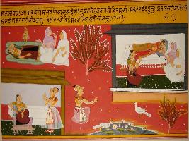 | Description / विवरण | Miniature painting based on Sanskrit drama Malti Madhav. On upper part a woman is depicted lying on banana leaves and Madyantika and Lawangika sitting near her talking about her dream who saw Makarand and his lotus like eyes. |