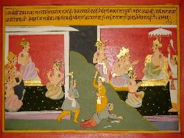 | Description / विवरण | Miniature painting based on Prithviraj Raso depicting Prithviraj s assembly and Nimer Rao ask Chandvardai about Jaichand s court. On the right side court of Jaichand is depicted. |